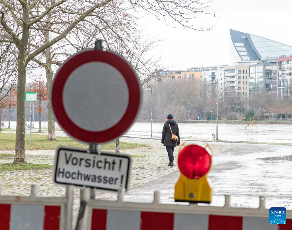 A warning sign of floods is seen in Frankfurt, Germany, Jan. 7, 2024. Some areas in Frankfurt were flooded due to continuous rainfall and rising water level of the Main River. (Xinhua/Zhang Fan)
