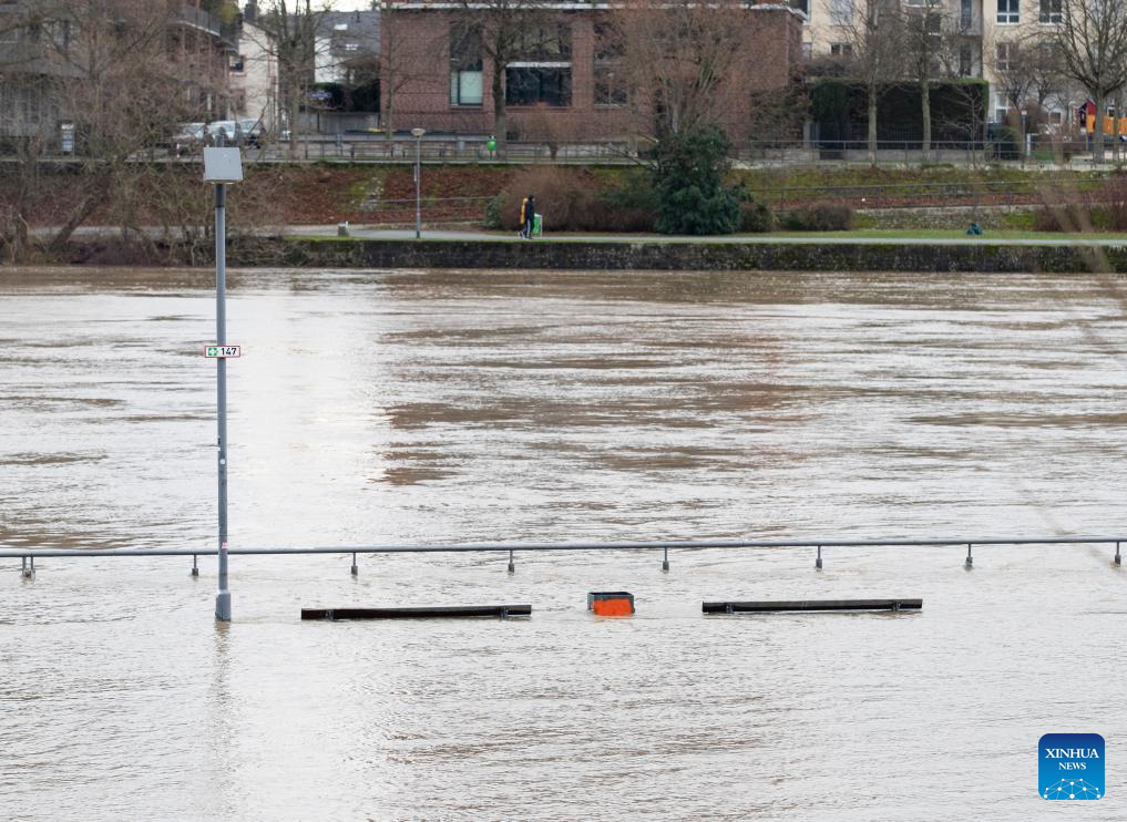 Benches along the Main River are submerged in flood water in Frankfurt, Germany, Jan. 7, 2024. Some areas in Frankfurt were flooded due to continuous rainfall and rising water level of the Main River. (Xinhua/Zhang Fan)