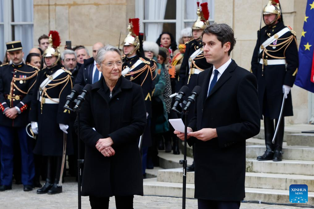 Gabriel Attal (R, Front) delivers a speech at the ceremony of power transfer in Hotel Matignon, official residence of the Prime Minister of France, in Paris, France, Jan. 9, 2024. French President Emmanuel Macron on Tuesday appointed Gabriel Attal as prime minister following the resignation of former head of government Elisabeth Borne, announced the presidential palace, the Elysee. (Photo by Rit Heize/Xinhua)