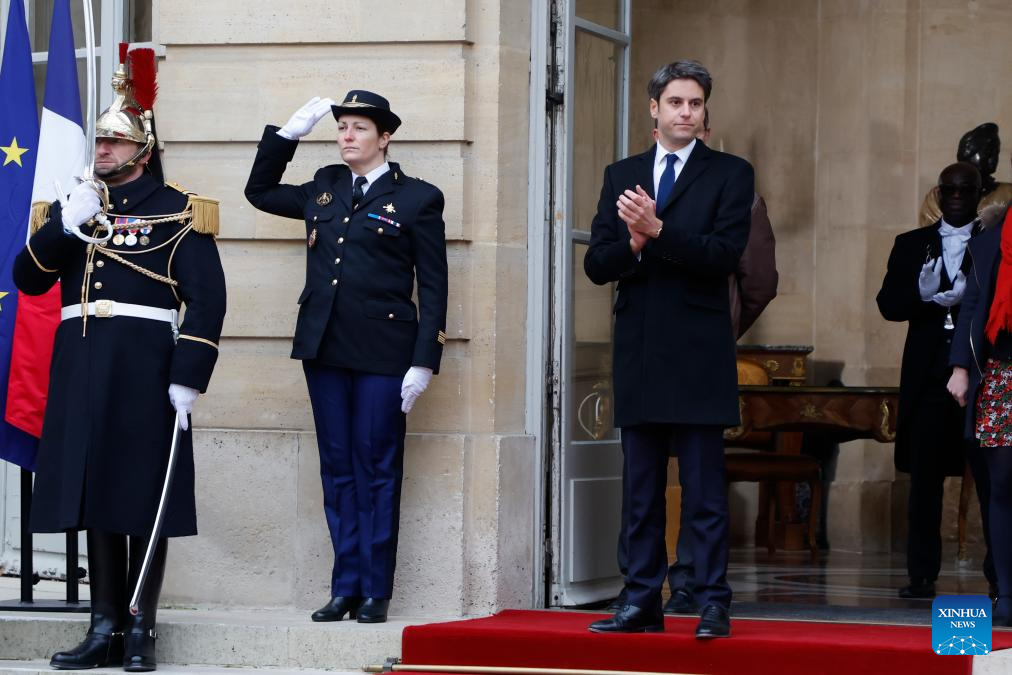 Gabriel Attal (3rd, L) attends the ceremony of power transfer in Hotel Matignon, official residence of the Prime Minister of France, in Paris, France, Jan. 9, 2024. French President Emmanuel Macron on Tuesday appointed Gabriel Attal as prime minister following the resignation of former head of government Elisabeth Borne, announced the presidential palace, the Elysee. (Photo by Rit Heize/Xinhua)