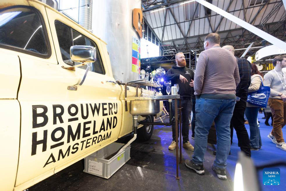 People visit a stand of a Dutch brewery at HORECAVA 2024 in Amsterdam, the Netherlands, on Jan. 9, 2024. HORECAVA, a Dutch trade fair for food, beverage and service industry, is held here from Monday to Thursday. (Photo by Sylvia Lederer/Xinhua)