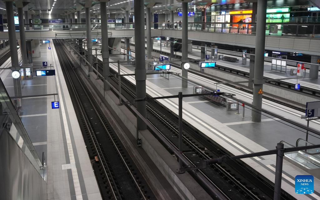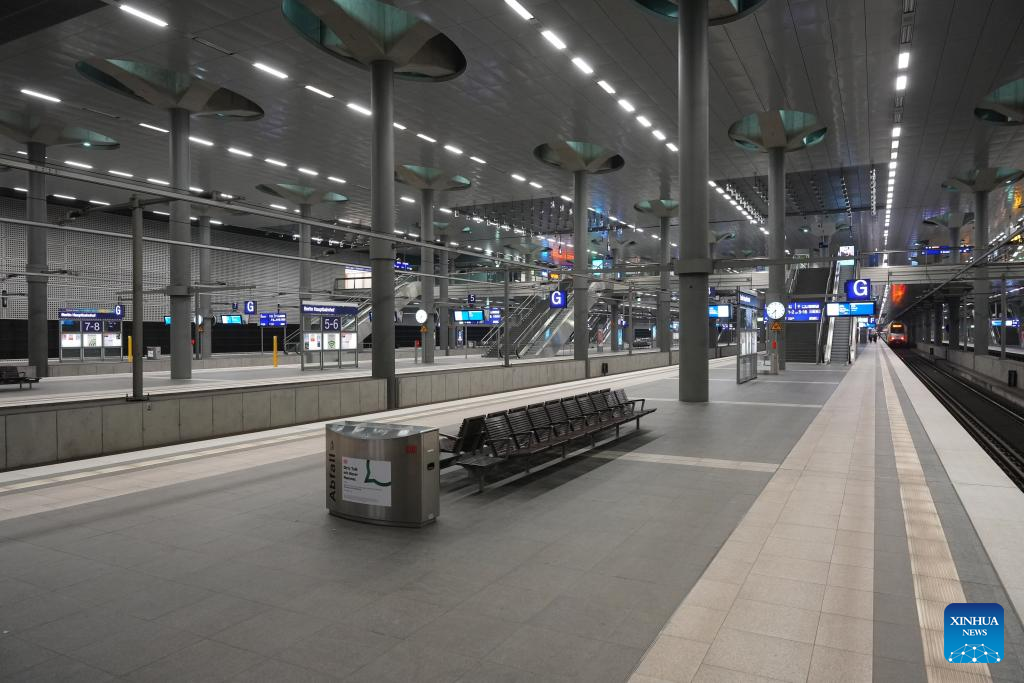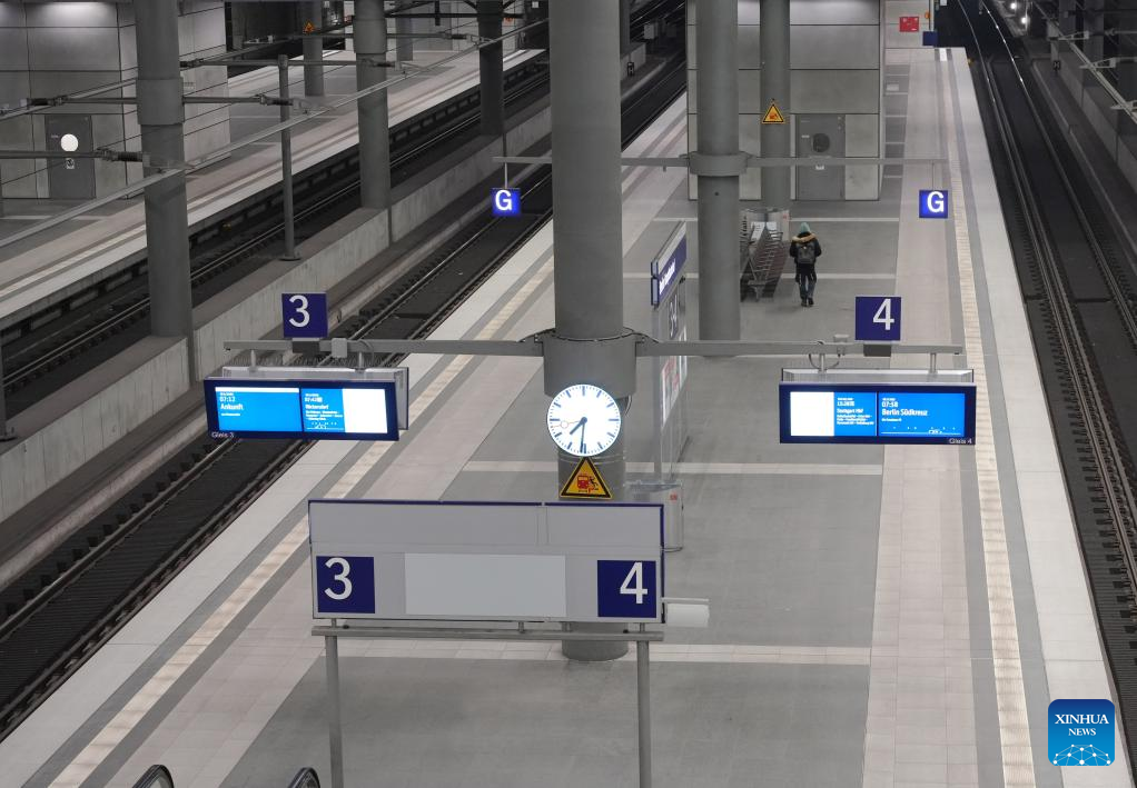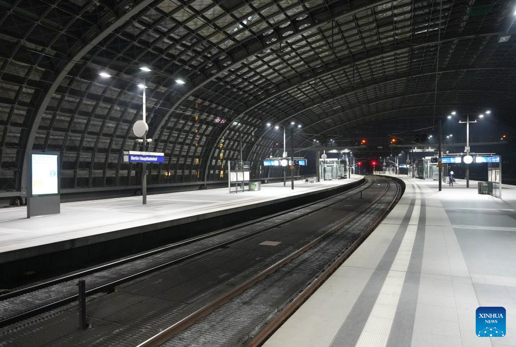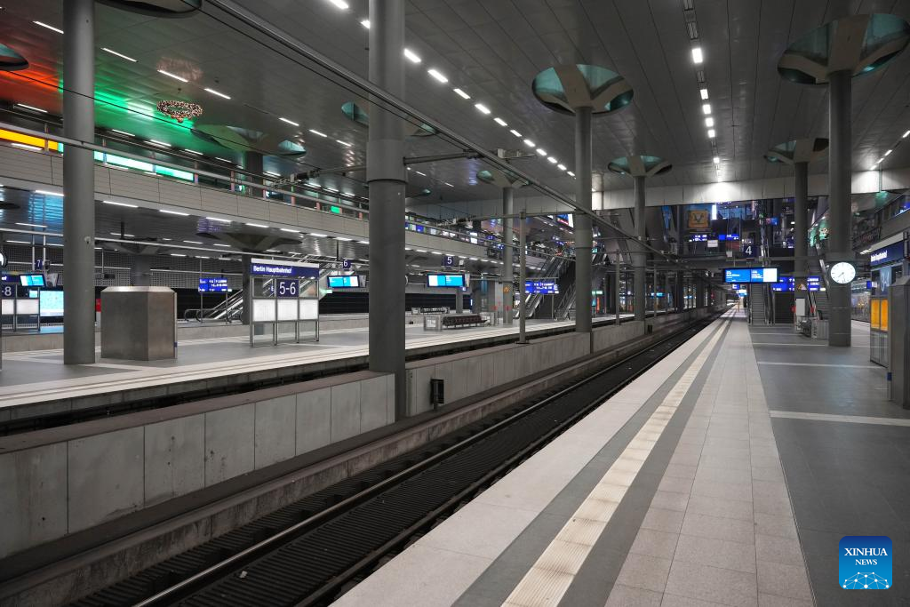 This photo taken on Jan. 10, 2024 shows platforms at Berlin Central Train Station in Berlin, Germany. Train drivers in Germany went on strike for three days starting from Wednesday, severely restricting passenger transport across the country. Meanwhile, freight trains have been at a standstill since Tuesday night. (Photo by Stefan Zeitz/Xinhua)