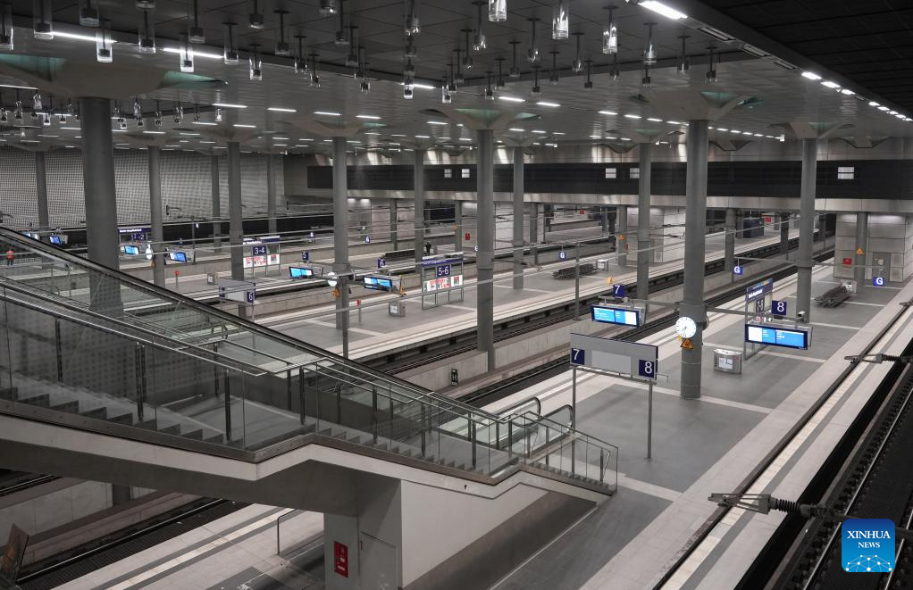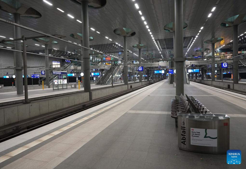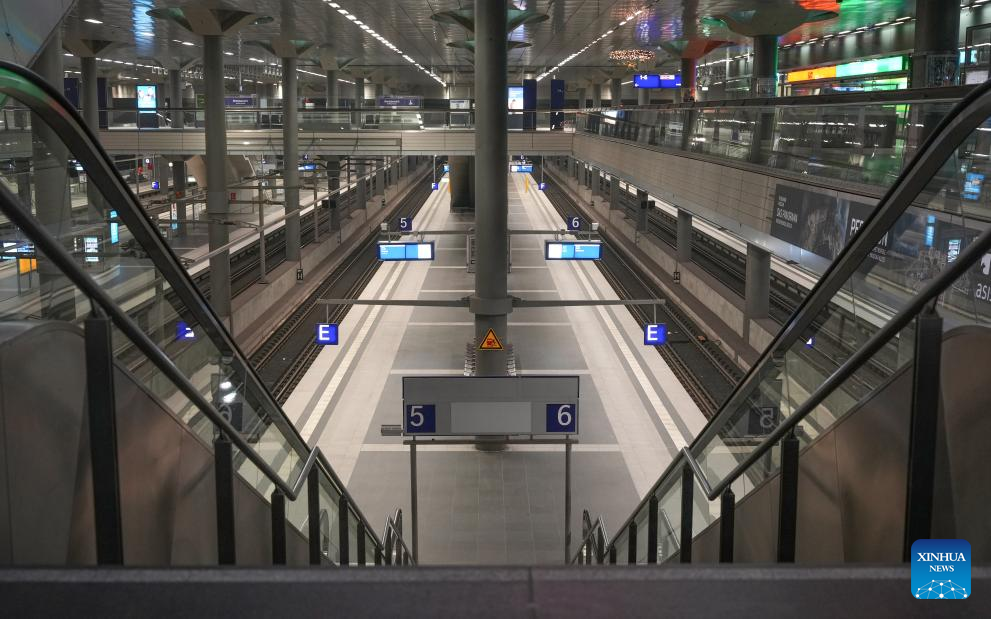 This photo taken on Jan. 10, 2024 shows empty platforms at Berlin Central Train Station in Berlin, Germany. Train drivers in Germany went on strike for three days starting from Wednesday, severely restricting passenger transport across the country. Meanwhile, freight trains have been at a standstill since Tuesday night. (Photo by Stefan Zeitz/Xinhua)