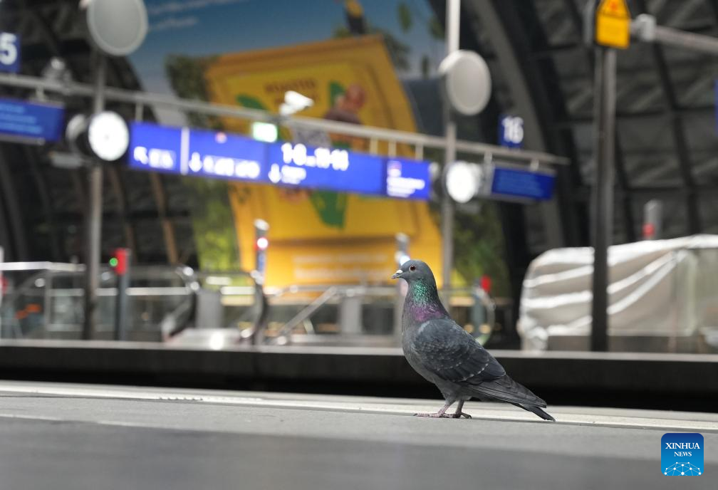 A pigeon is seen at a platform of Berlin Central Train Station in Berlin, Germany, Jan. 10, 2024. Train drivers in Germany went on strike for three days starting from Wednesday, severely restricting passenger transport across the country. Meanwhile, freight trains have been at a standstill since Tuesday night. (Photo by Stefan Zeitz/Xinhua)