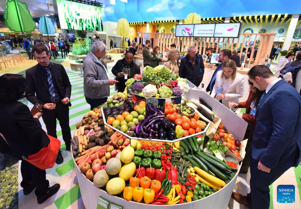 People visit a booth of fruit and vegetables during the International Green Week in Berlin, Germany, on Jan. 19, 2024. The International Green Week, a leading trade fair for food, agriculture and horticulture, opened to visitors on Friday in Berlin and will run until Jan. 28. (Photo by Ren Pengfei/Xinhua)