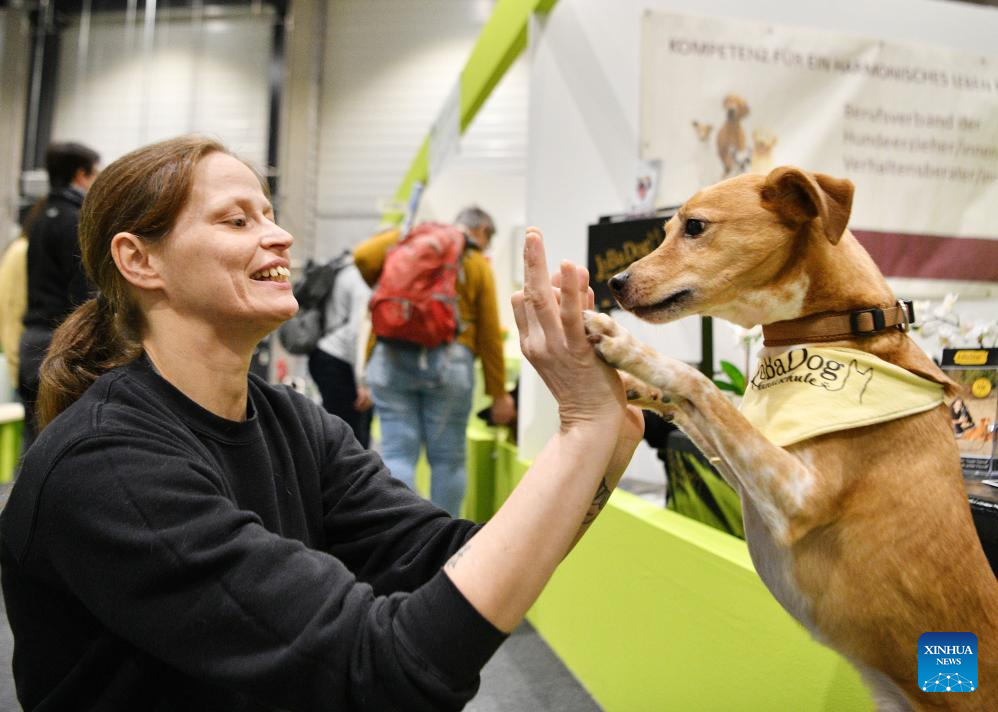 An exhibitor interacts with a dog during the International Green Week in Berlin, Germany, on Jan. 19, 2024. The International Green Week, a leading trade fair for food, agriculture and horticulture, opened to visitors on Friday in Berlin and will run until Jan. 28. (Photo by Ren Pengfei/Xinhua)