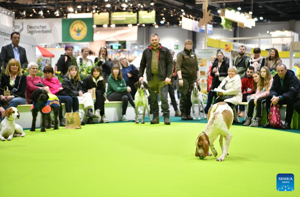 A dog performs during the International Green Week in Berlin, Germany, on Jan. 19, 2024. The International Green Week, a leading trade fair for food, agriculture and horticulture, opened to visitors on Friday in Berlin and will run until Jan. 28. (Photo by Ren Pengfei/Xinhua)