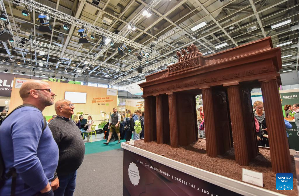 People look at a model of the Brandenburg Gate made of chocolate during the International Green Week in Berlin, Germany, on Jan. 19, 2024. The International Green Week, a leading trade fair for food, agriculture and horticulture, opened to visitors on Friday in Berlin and will run until Jan. 28. (Photo by Ren Pengfei/Xinhua)
