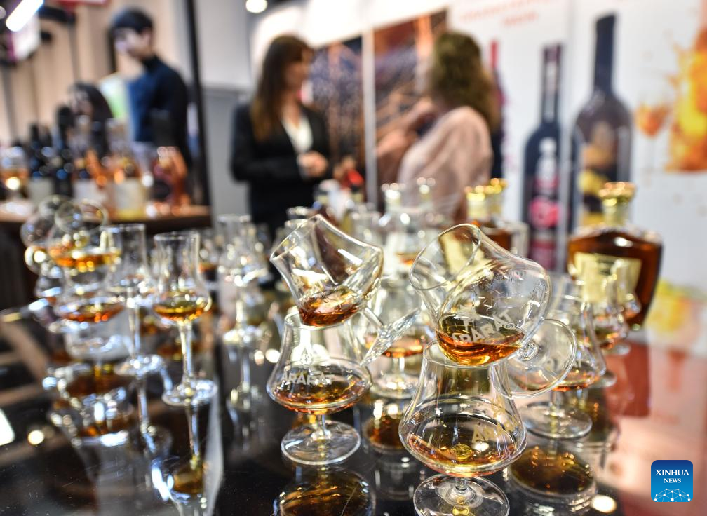 Photo taken on Jan. 19, 2024 shows brandy exhibited during the International Green Week in Berlin, Germany. The International Green Week, a leading trade fair for food, agriculture and horticulture, opened to visitors on Friday in Berlin and will run until Jan. 28. (Photo by Ren Pengfei/Xinhua)