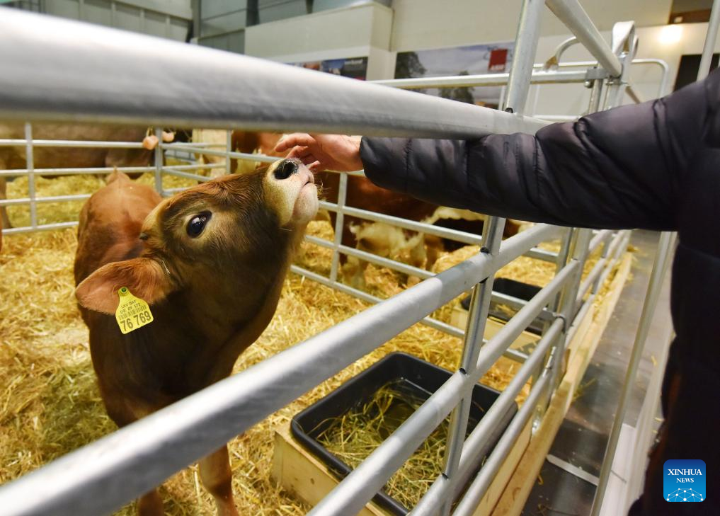 A visitor interacts with a calf during the International Green Week in Berlin, Germany, on Jan. 19, 2024. The International Green Week, a leading trade fair for food, agriculture and horticulture, opened to visitors on Friday in Berlin and will run until Jan. 28. (Photo by Ren Pengfei/Xinhua)