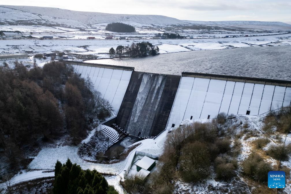 An aerial drone photo taken on Jan. 19, 2024 shows a view of Booth Wood Reservoir after snowfall in West Yorkshire, Britain. (Photo by Jon Super/Xinhua)