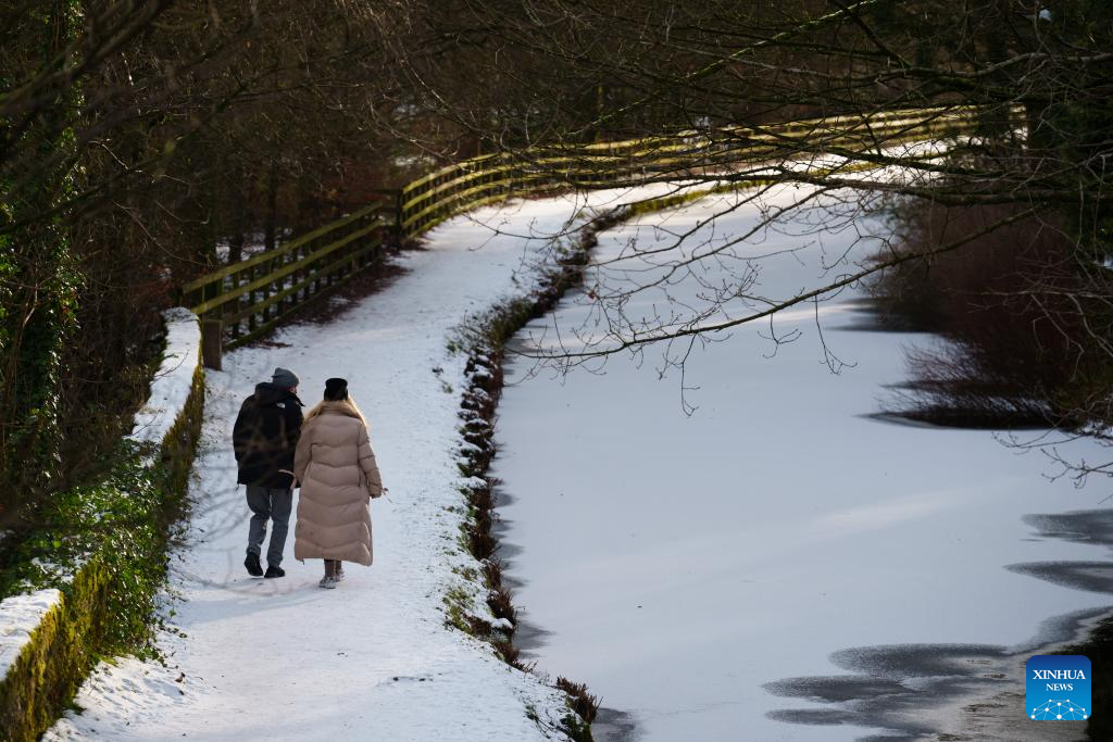 People walk on a road covered with snow in northern England, Britain, Jan. 19, 2024. (Photo by Jon Super/Xinhua)