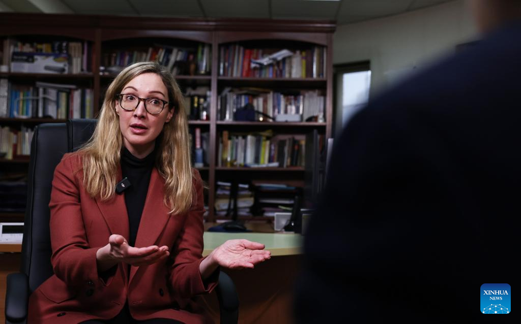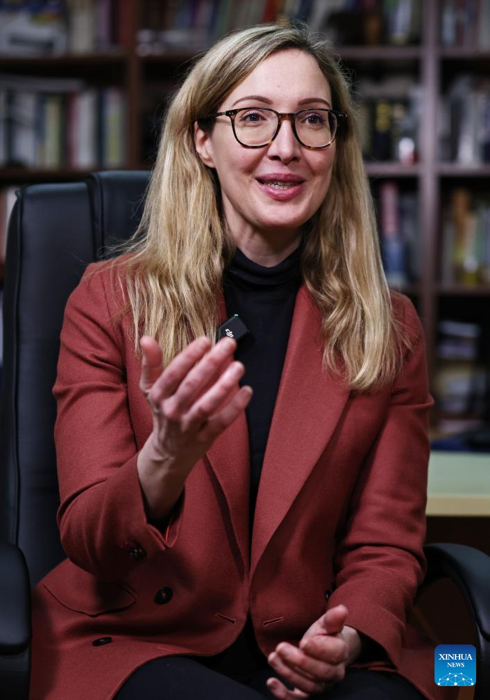 Nathalie de Gaulle, great-granddaughter of the former French President Charles de Gaulle, speaks during an interview with Xinhua in Paris, France, Jan. 8, 2024. (Xinhua/Gao Jing)