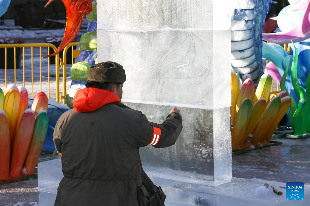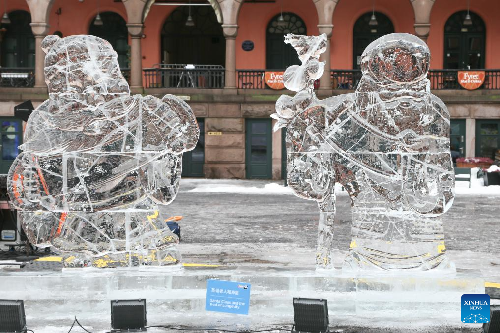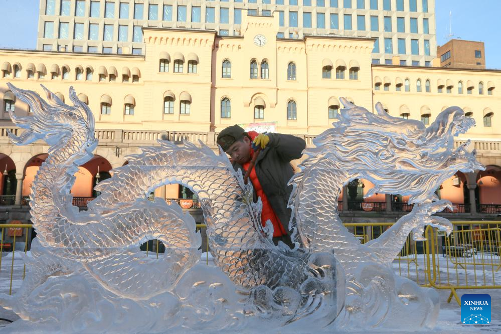 A craftsman makes an ice sculpture in Oslo, capital of Norway, Jan. 27, 2024. An exhibition featuring Chinese ice sculptures and lanterns opened in Oslo on Sunday, drawing crowds of visitors with Chinese culture set against Norwegian landscapes.