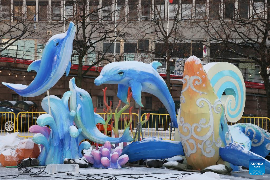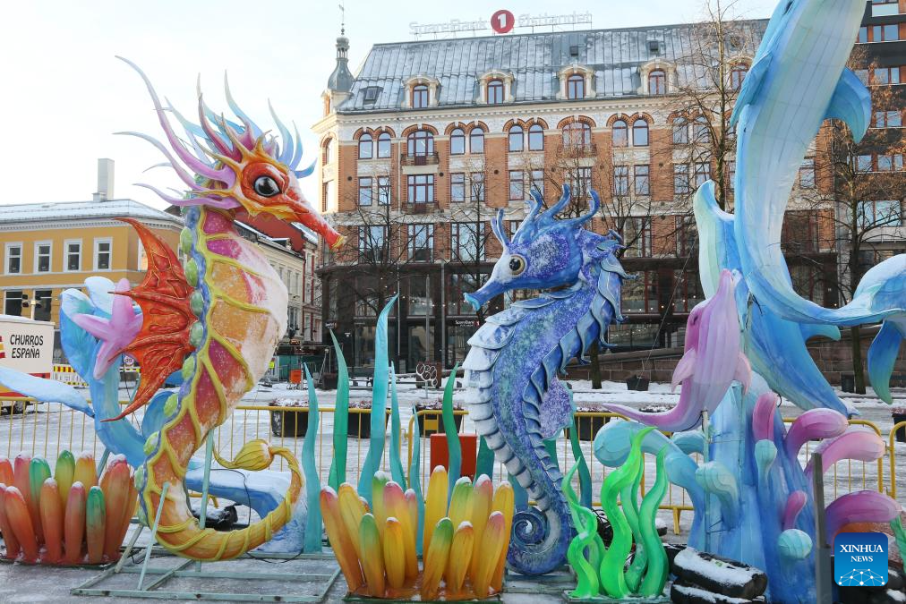This photo taken on Jan. 27, 2024 shows some festive lanterns displayed in Oslo, capital of Norway. An exhibition featuring Chinese ice sculptures and lanterns opened in Oslo on Sunday, drawing crowds of visitors with Chinese culture set against Norwegian landscapes.