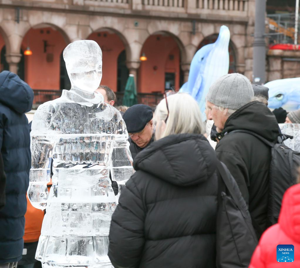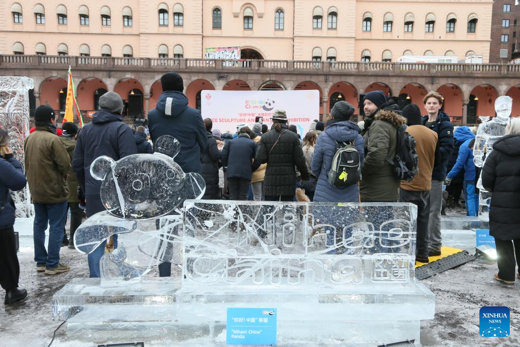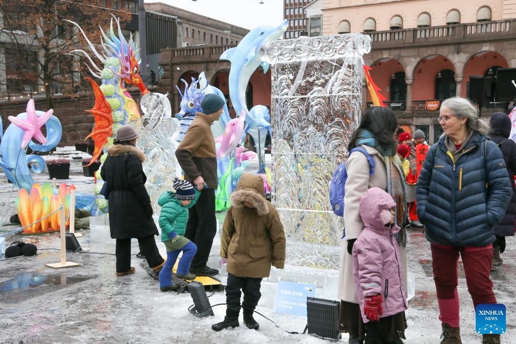 Visitors watch ice sculptures and lanterns in Oslo, capital of Norway, Jan. 28, 2024. An exhibition featuring Chinese ice sculptures and lanterns opened in Oslo on Sunday, drawing crowds of visitors with Chinese culture set against Norwegian landscapes.