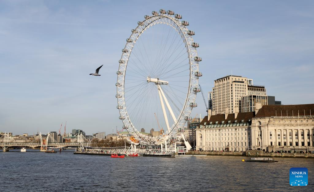 This photo taken on Jan. 28, 2024 shows a view of the London Eye and the River Thames in London, Britain. According to the Met Office, Britain's national meteorological service, Jan. 28 was the hottest January day ever recorded in the UK, with the temperature exceeding 19 degrees Celsius. (Xinhua/Li Ying)