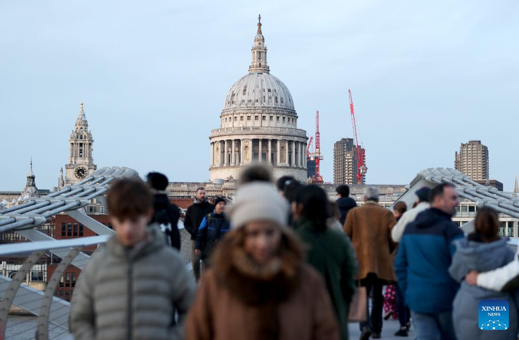 People walk near St. Paul's Cathedral in London, Britain, on Jan. 28, 2024. According to the Met Office, Britain's national meteorological service, Jan. 28 was the hottest January day ever recorded in the UK, with the temperature exceeding 19 degrees Celsius. (Xinhua/Li Ying)