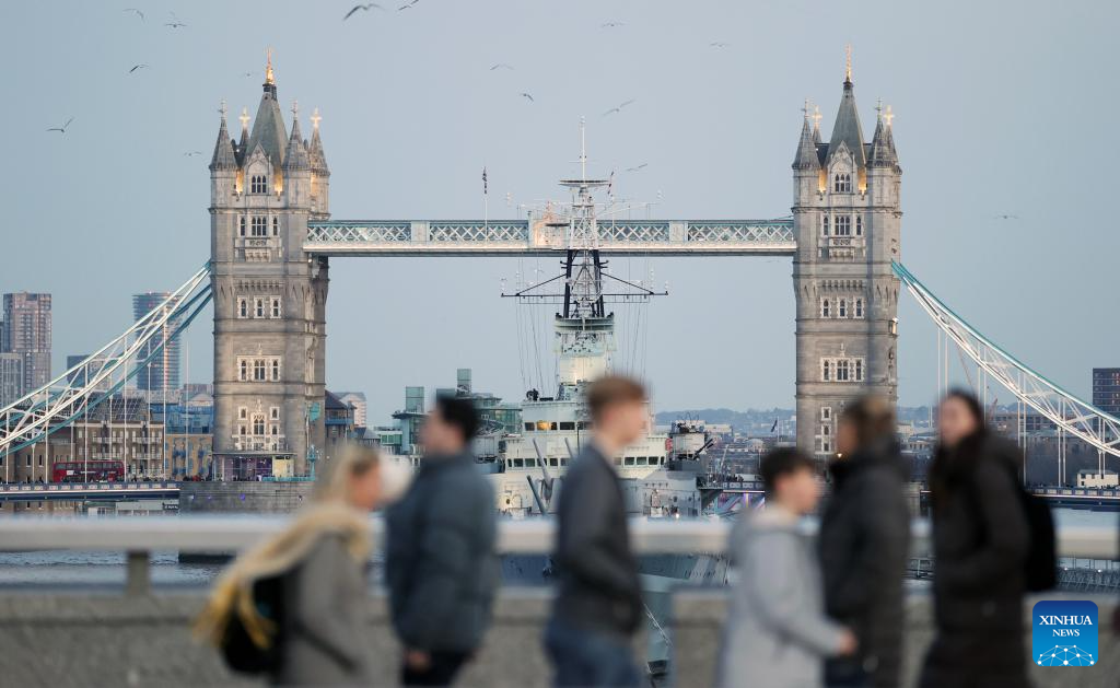 People walk on the London Bridge in London, Britain, Jan. 28, 2024. According to the Met Office, Britain's national meteorological service, Jan. 28 was the hottest January day ever recorded in the UK, with the temperature exceeding 19 degrees Celsius. (Xinhua/Li Ying)