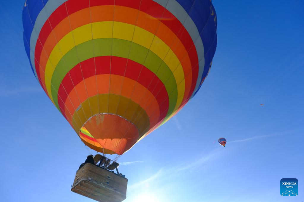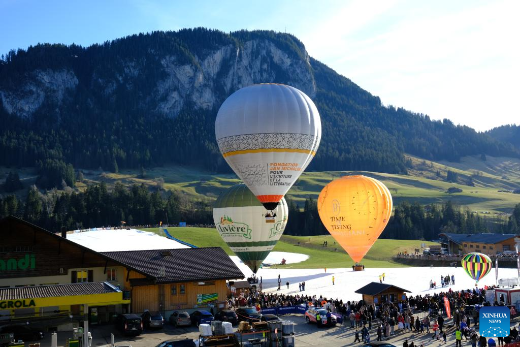 Balloons take off at the 44th International Ballon Festival in Chateau-d'Oex, Switzerland, Jan. 28, 2024. The 9-day ballon festival closed here on Sunday with the participation of over 60 balloons from 15 countries and regions. (Xinhua/Chen Binjie)