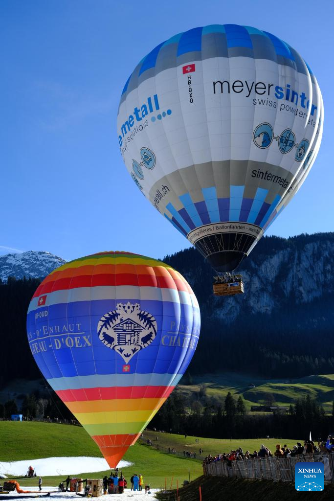 Balloons prepare to take off at the 44th International Ballon Festival in Chateau-d'Oex, Switzerland, Jan. 28, 2024. The 9-day ballon festival closed here on Sunday with the participation of over 60 balloons from 15 countries and regions. (Xinhua/Chen Binjie)