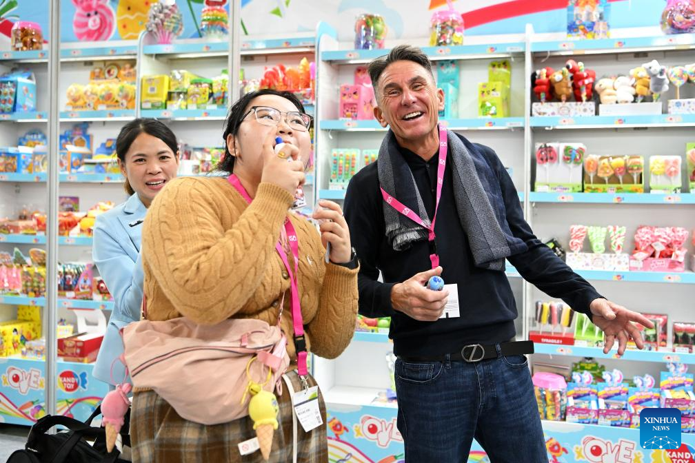 Chinese exhibitors talk with a visitor at ISM in Cologne, Germany, Jan. 28, 2024. The world's leading trade fair for sweets and snacks ISM runs from Jan. 28 to 31, 2024. (Photo by Ulrich Hufnagel/Xinhua)