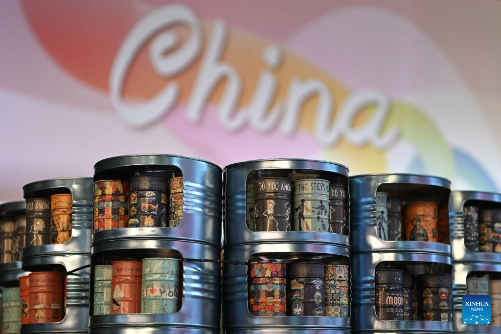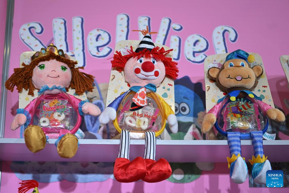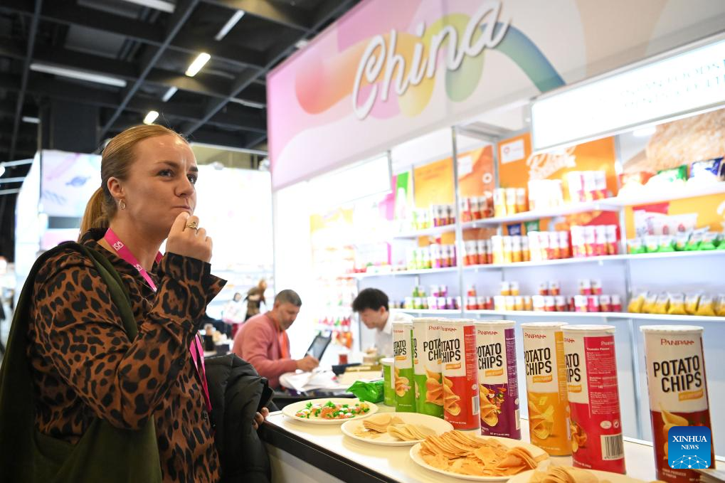 This photo taken on Jan. 28, 2024 shows products displayed at the exhibition area of China at ISM in Cologne, Germany. The world's leading trade fair for sweets and snacks ISM runs from Jan. 28 to 31, 2024. (Photo by Ulrich Hufnagel/Xinhua)