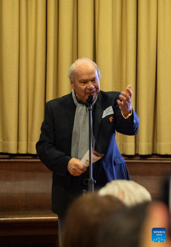 Klaus Schlappner, the first foreign head coach of China Men's National Football Team, speaks during an event celebrating China-Germany friendship in Frankfurt, Germany, Jan. 27, 2024. Klaus Schlappner was among nine Germans honored for contributing to Chinese-German friendship over recent decades at the Chinese Consulate General in Frankfurt Saturday. (Xinhua/Zhang Fan)