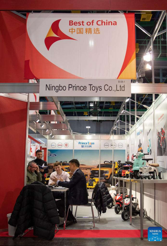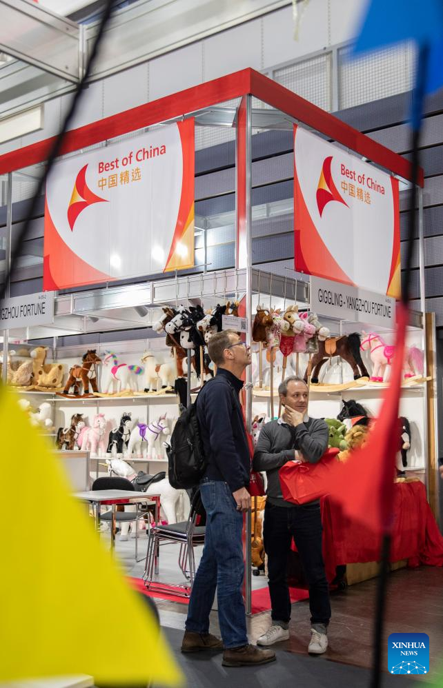 People visit the Best of China joint booth at the Nuremberg International Toy Fair (Spielwarenmesse) in Nuremberg, Germany, Jan. 30, 2024. As a leading trade fair for toys, hobbies and leisure, the Spielwarenmesse kicked off here on Tuesday with over 2,100 participating companies from around the world. (Xinhua/Zhang Fan)