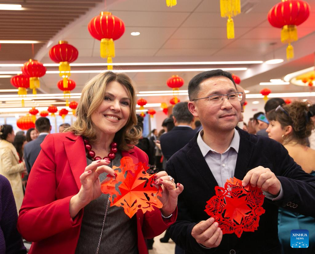 Participants show paper cutting works during an event to celebrate the Chinese Lunar New Year at the headquarters of the United Nations Food and Agriculture Organization (FAO) in Rome, Italy, on Feb. 2, 2024. The United Nations Food and Agriculture Organization (FAO) held a high-level event at its headquarters here on Friday to mark the upcoming Chinese Lunar New Year. (Xinhua/Li Jing)