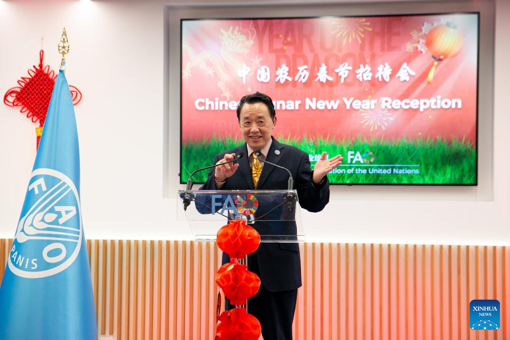 FAO Director-General Qu Dongyu speaks at an event to celebrate the Chinese Lunar New Year at the headquarters of the United Nations Food and Agriculture Organization (FAO) in Rome, Italy, on Feb. 2, 2024. The United Nations Food and Agriculture Organization (FAO) held a high-level event at its headquarters here on Friday to mark the upcoming Chinese Lunar New Year. (Xinhua/Li Jing)