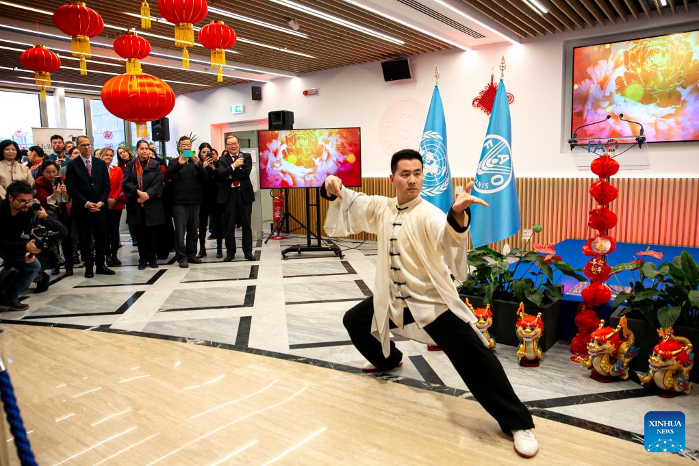 Participants watch a Taichi performance during an event to celebrate the Chinese Lunar New Year at the headquarters of the United Nations Food and Agriculture Organization (FAO) in Rome, Italy, on Feb. 2, 2024. The United Nations Food and Agriculture Organization (FAO) held a high-level event at its headquarters here on Friday to mark the upcoming Chinese Lunar New Year. (Xinhua/Li Jing)