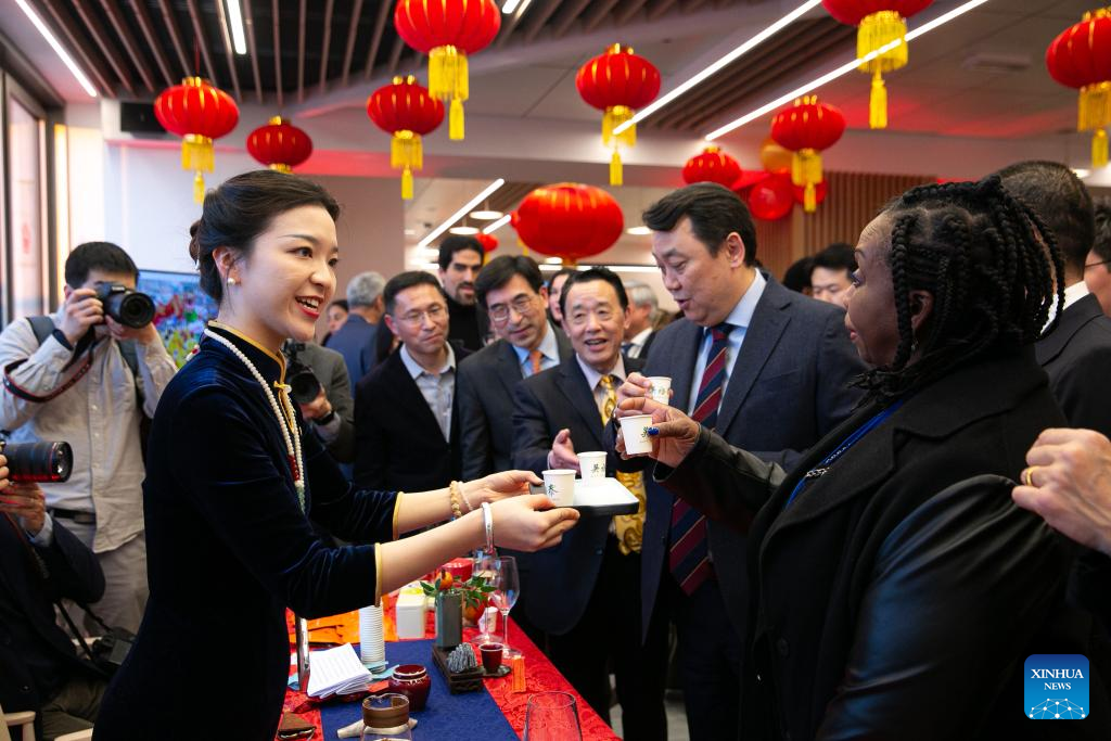 Participants taste Chinese tea during an event to celebrate the Chinese Lunar New Year at the headquarters of the United Nations Food and Agriculture Organization (FAO) in Rome, Italy, on Feb. 2, 2024. The United Nations Food and Agriculture Organization (FAO) held a high-level event at its headquarters here on Friday to mark the upcoming Chinese Lunar New Year. (Xinhua/Li Jing)
