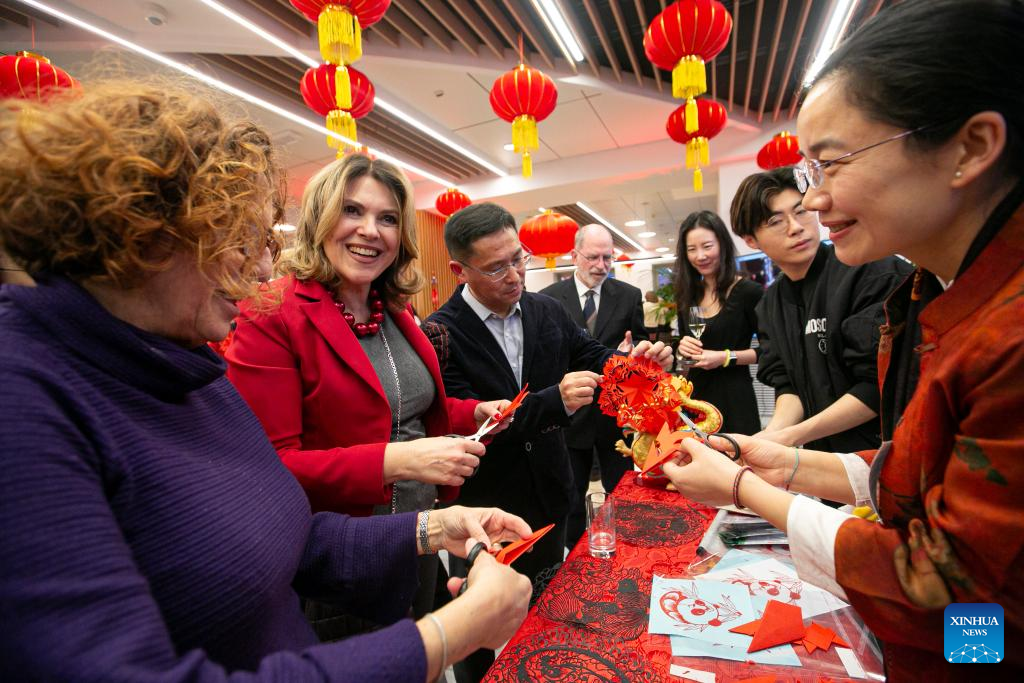Participants learn to make paper cutting works during an event to celebrate the Chinese Lunar New Year at the headquarters of the United Nations Food and Agriculture Organization (FAO) in Rome, Italy, on Feb. 2, 2024. The United Nations Food and Agriculture Organization (FAO) held a high-level event at its headquarters here on Friday to mark the upcoming Chinese Lunar New Year. (Xinhua/Li Jing)