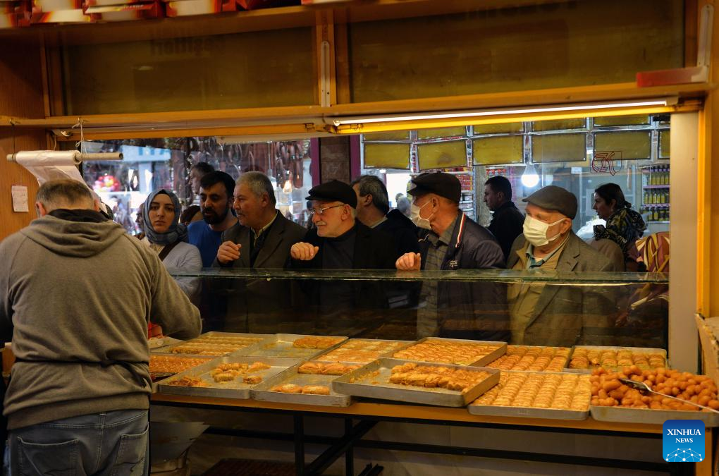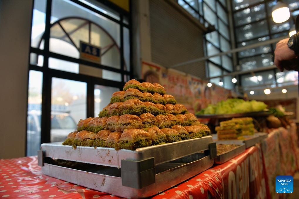 People buy baklava, a flaky and nutty pastry that is renowned in Türkiye, at a bakery in Ankara, Türkiye, on Feb. 1, 2024. (Photo by Mustafa Kaya/Xinhua)