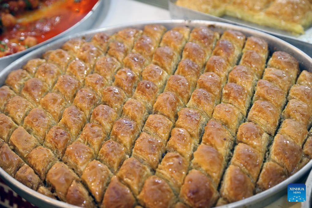 A tray of Baklava, a flaky and nutty pastry that is renowned in Türkiye, is displayed at a bakery in Ankara, Türkiye, on Feb. 1, 2024. (Photo by Mustafa Kaya/Xinhua)
