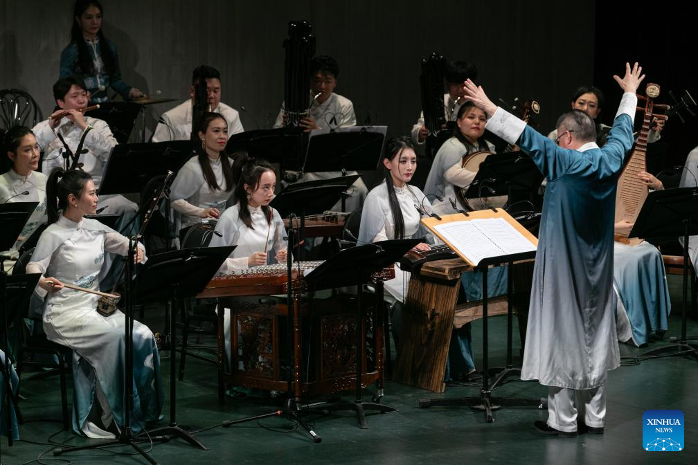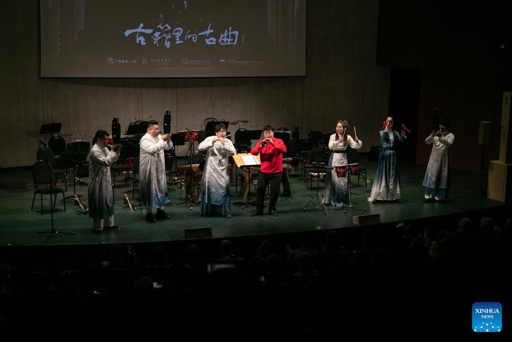 Artists from the China Coal Mine Art Troupe stage the concert "Ancient Songs in Ancient Books" as part of the "Happy Chinese New Year" cultural event in Moscow, Russia, Jan. 30, 2024. (Xinhua/Bai Xueqi)