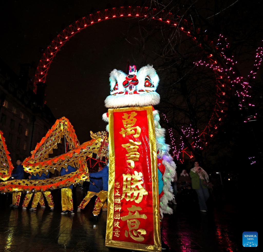 Traditional Chinese lion dancers perform in front of the London Eye which is lit up in red to celebrate the upcoming Chinese New Year in London, Britain, Feb. 8, 2024. As part of the Spring Festival celebrations, the London Eye, one of Britain's major landmarks, was illuminated in red and gold on Thursday, the auspicious colors traditionally used for the traditional festival, also known as the Chinese New Year. (Xinhua/Li Ying)