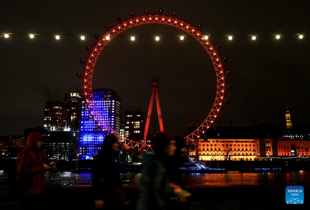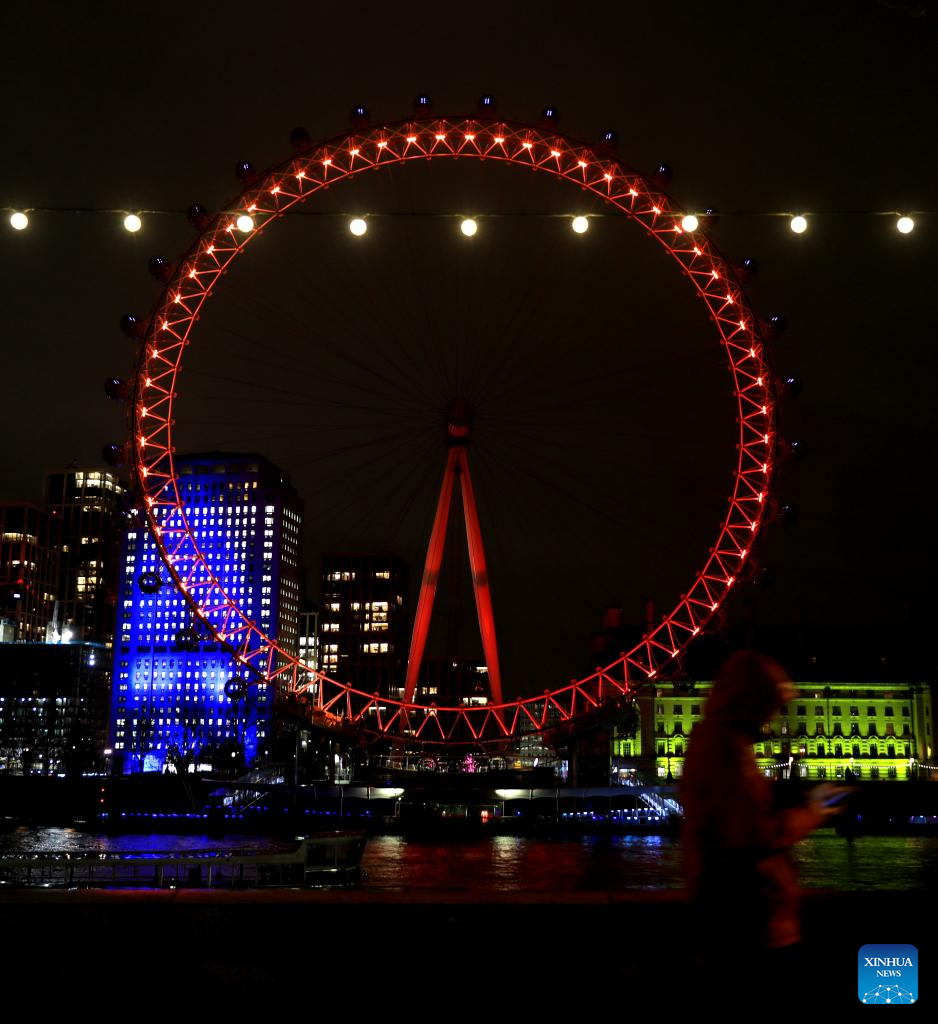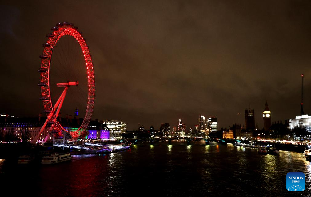 The London Eye is lit up in red to celebrate the upcoming Chinese New Year in London, Britain, on Feb. 8, 2024. As part of the Spring Festival celebrations, the London Eye, one of Britain's major landmarks, was illuminated in red and gold on Thursday, the auspicious colors traditionally used for the traditional festival, also known as the Chinese New Year. (Xinhua/Li Ying)