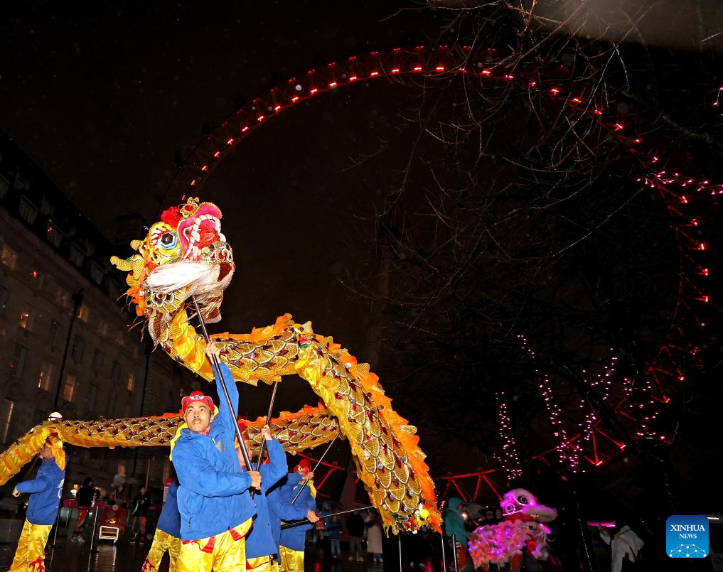 Traditional Chinese dragon dancers perform in front of the London Eye which is lit up in red to celebrate the upcoming Chinese New Year in London, Britain, Feb. 8, 2024. As part of the Spring Festival celebrations, the London Eye, one of Britain's major landmarks, was illuminated in red and gold on Thursday, the auspicious colors traditionally used for the traditional festival, also known as the Chinese New Year. (Xinhua/Li Ying)