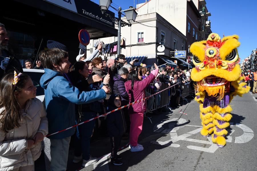 MADRID, Feb. 14 (Xinhua) -- Thousands of people celebrated the Chinese New Year over the weekend in several cities in Spain, including the capital Madrid, where a massive parade to celebrate the arrival of the Year of the Dragon was held on Sunday.