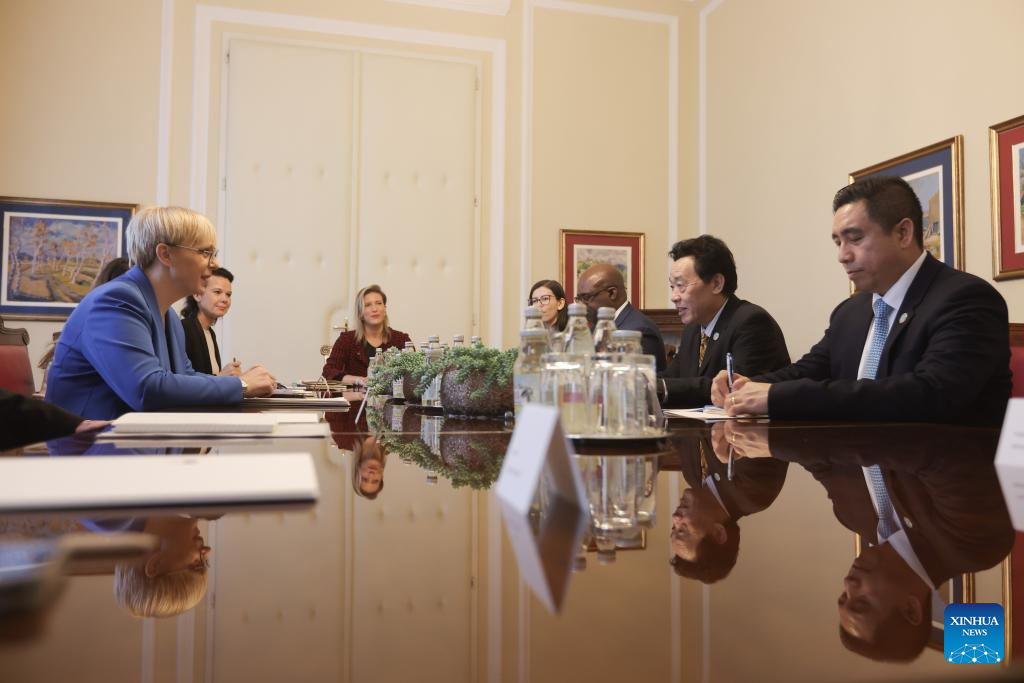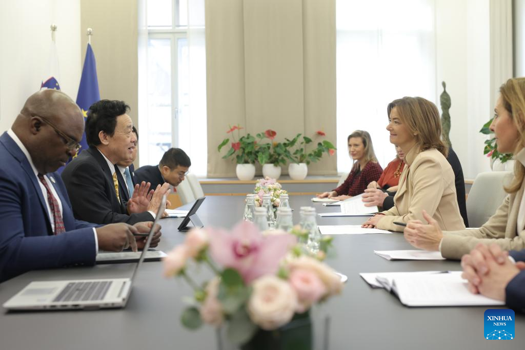 Qu Dongyu, director-general of the United Nations Food and Agriculture Organisation (FAO), meets with Slovenian President Natasa Pirc Musar in Ljubljana, Slovenia, Feb. 13, 2024. Qu Dongyu started a two-day visit to Slovenia on Tuesday to discuss global food safety with the incumbent non-permanent member of the UN Security Council. (Photo by Zeljko Stevanic/Xinhua)