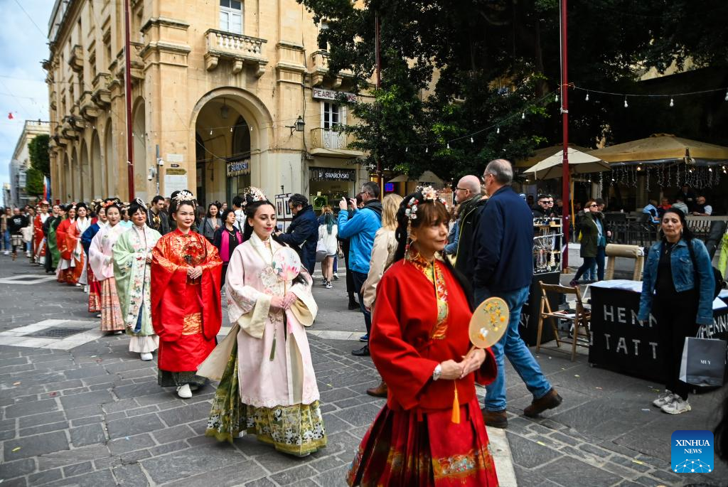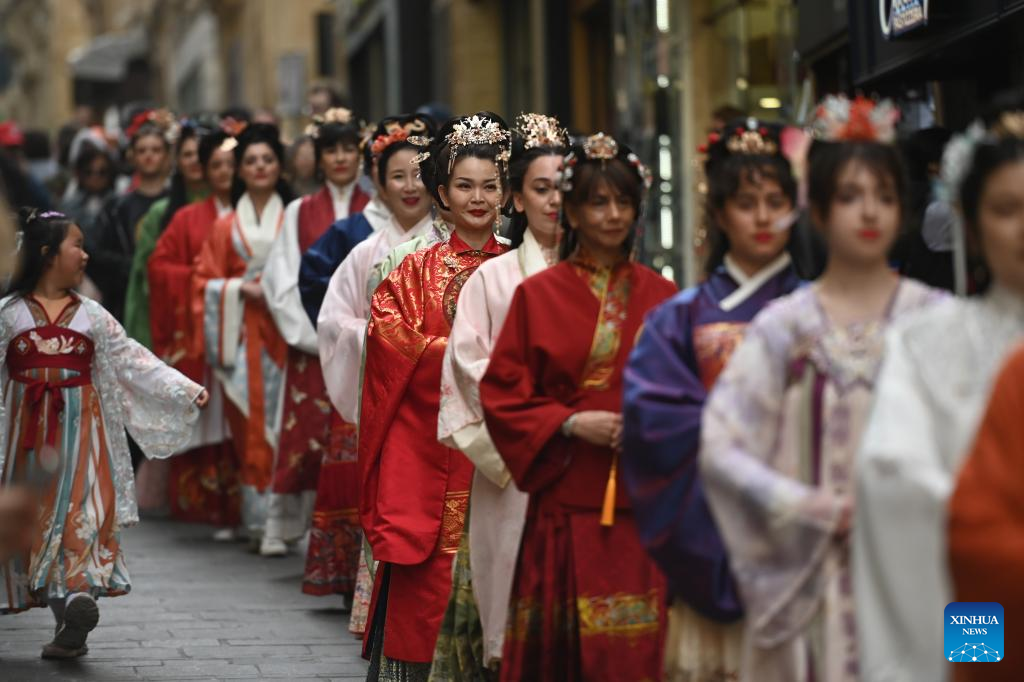 VALLETTA, Feb. 18 (Xinhua) -- In Valletta, the capital city of Malta, a group of ladies wearing colorful Chinese costumes - known as Hanfu, proceed gracefully along historic streets on Saturday afternoon, attracting both Maltese residents and tourists from around the world.