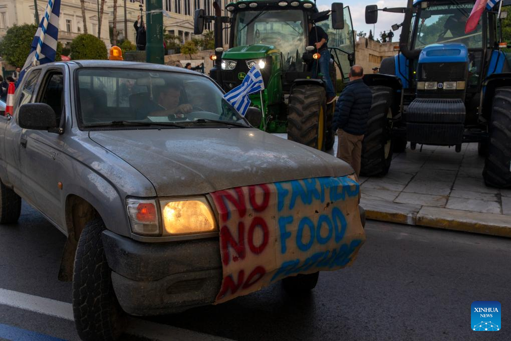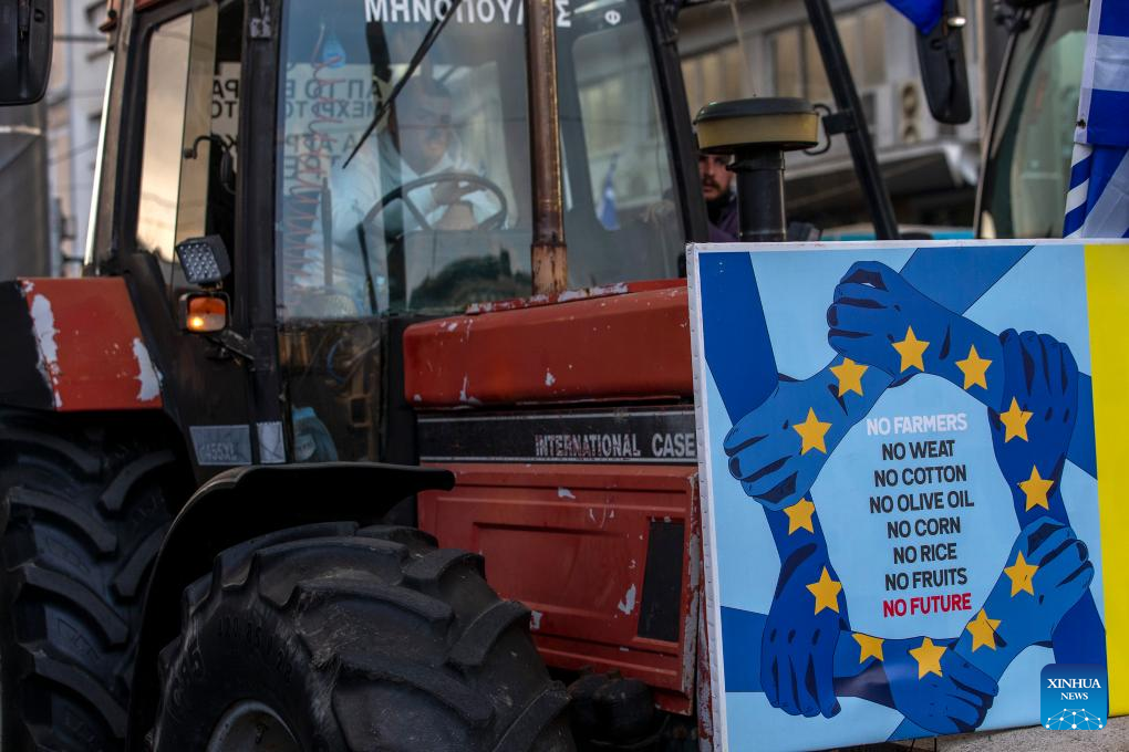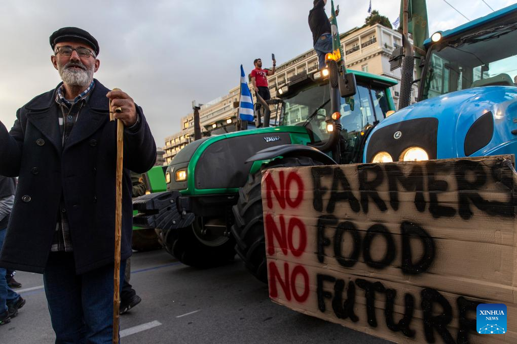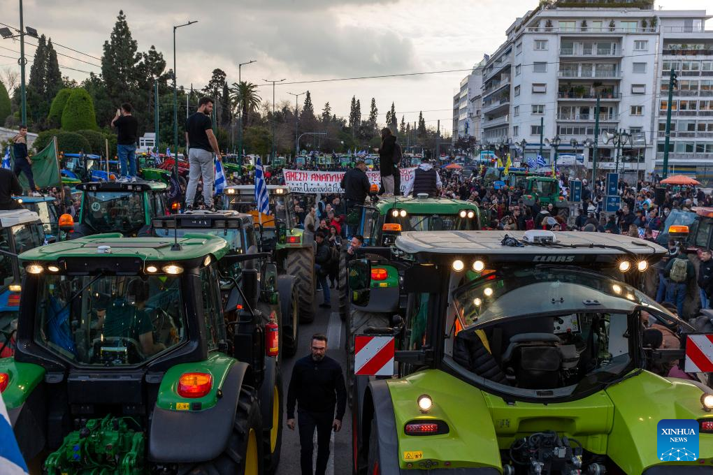 Greek farmers take part in a protest in Athens, Greece, on Feb. 20, 2024. Thousands of farmers protested in the center of Athens on Tuesday over increased production costs, requesting more state aid to stay in business. (Xinhua/Marios Lolos)