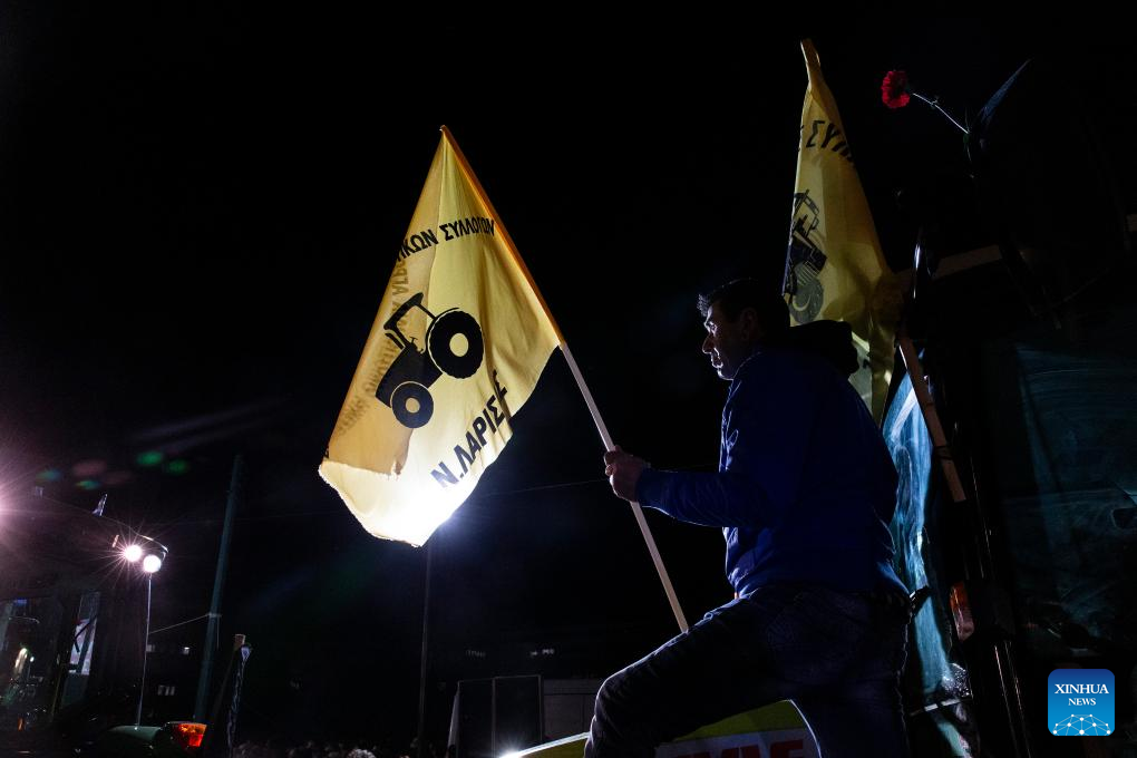 A Greek farmer takes part in a protest in Athens, Greece, on Feb. 20, 2024. Thousands of farmers protested in the center of Athens on Tuesday over increased production costs, requesting more state aid to stay in business. (Xinhua/Marios Lolos)