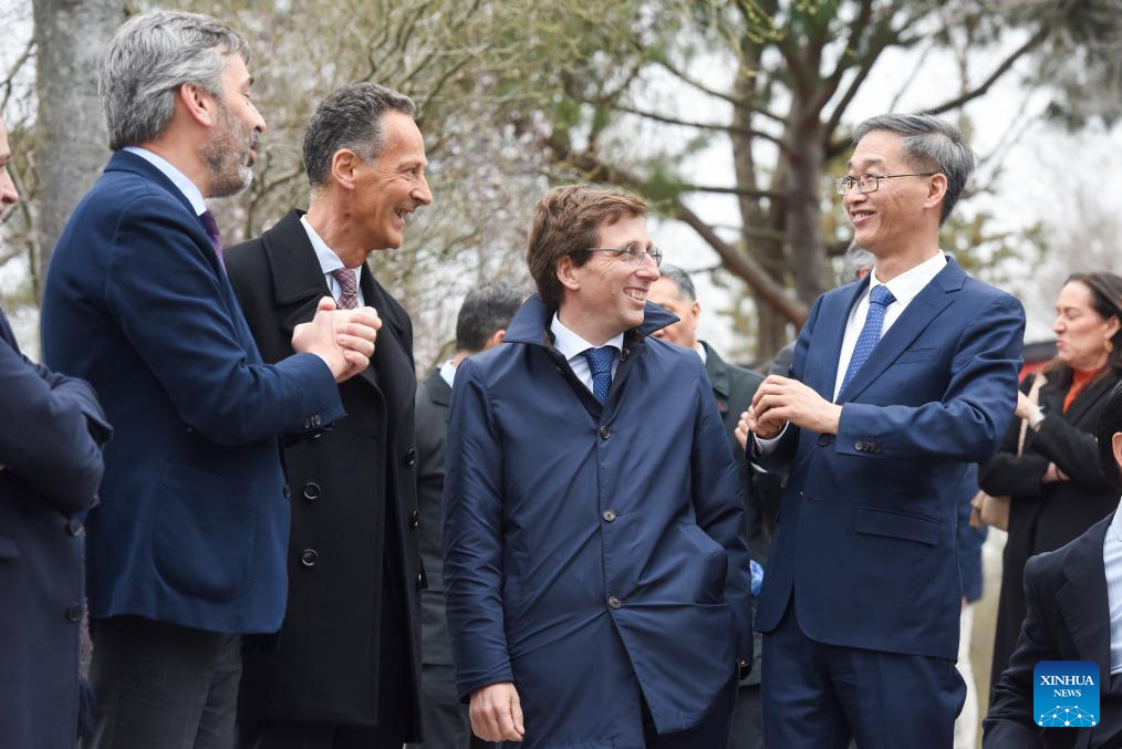 Chinese Ambassador to Spain Yao Jing (1st R, front) and Madrid's Mayor Jose Luis Martinez-Almeida (2nd R, front) attend the farewell party to panda family of five in Madrid, Spain, Feb. 22, 2024. A zoo in Spain's capital Madrid hosted a farewell party on Thursday to bid goodbye to its beloved panda family of five who will soon return to China.