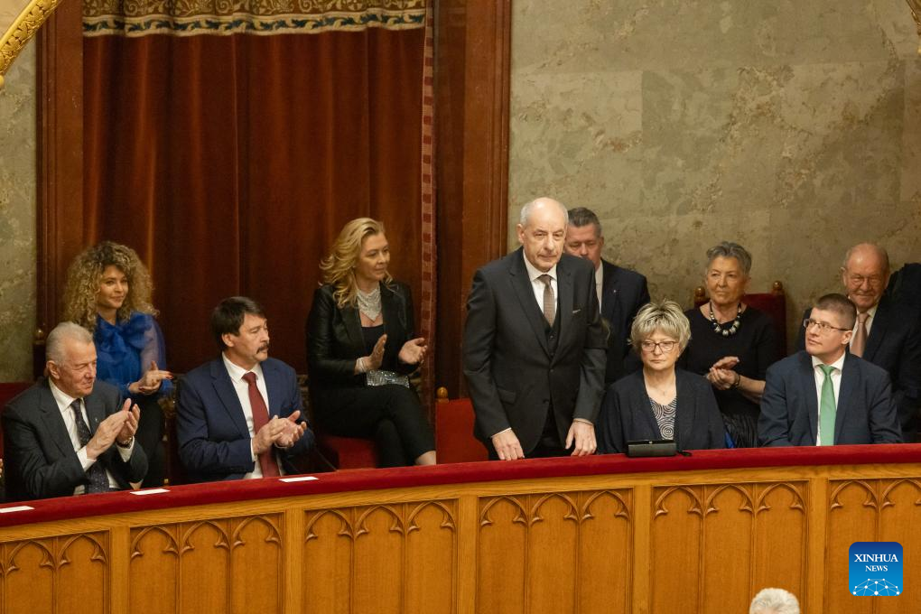 Tamas Sulyok (C) is seen after being elected as Hungary's new president at the Hungarian parliament in Budapest, Hungary, on Feb. 26, 2024. Hungarian lawmakers on Monday elected Tamas Sulyok, head of the Constitutional Court, as the country's new president. (Photo by Attila Volgyi/Xinhua)