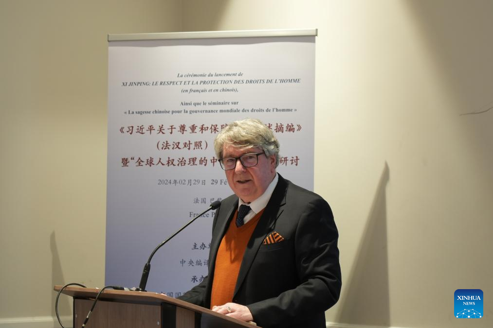 President of Saphir Eurasia Promotion agency Jean Pegouret speaks at the launch ceremony of Xi Jinping on Respecting and Protecting Human Rights (French-Chinese version) in Paris, France, Feb. 29, 2024. Dozens of French experts praised the important contribution of Chinese wisdom to global human rights governance at a thematic seminar here Thursday, in parallel with the launch of Xi Jinping on Respecting and Protecting Human Rights (French-Chinese version). (Xinhua/Zhang Baihui)