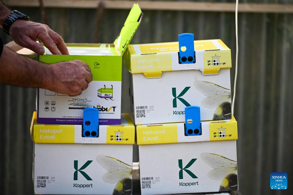 Farmer Joseph Muscat lets bumblebees fly out of their boxes to pollinate tomatoes in his greenhouse in Mgarr, Malta, on Feb. 26, 2024. Joseph Muscat comes from an established Maltese farming family with nine hectares of land, but is still struggling to remain competitive in the current agricultural climate of rising costs, strict rules, and unfair competition. (Photo by Jonathan Borg/Xinhua)