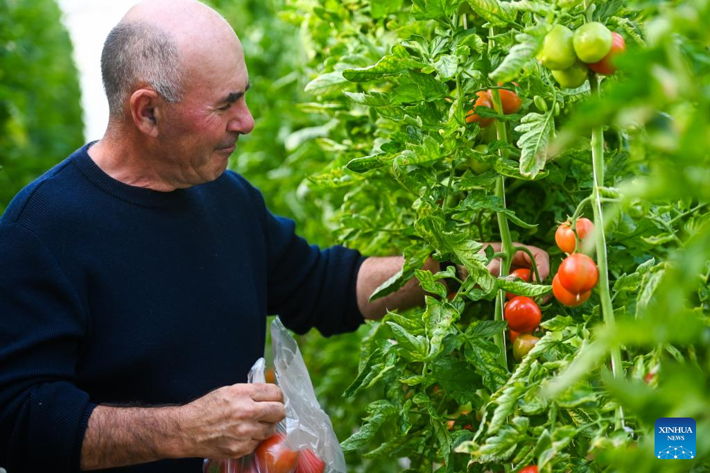 Farmer Joseph Muscat picks tomatoes in his greenhouse in Mgarr, Malta, on Feb. 26, 2024. Joseph Muscat comes from an established Maltese farming family with nine hectares of land, but is still struggling to remain competitive in the current agricultural climate of rising costs, strict rules, and unfair competition. (Photo by Jonathan Borg/Xinhua)